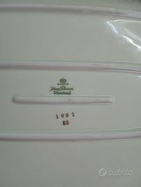 Questo raffinato set include 12 piatti fondi, 12 piatti piani, 12 piatti da dessert, un vassoio ovale lungo 38 cm e un piatto tondo diametro 30 cm, incarnando l’eccellenza dell’artigianato tedesco. Realizzato in porcellana di alta qualità, ogni elemento si distingue per il suo colore avorio, arricchito da un elegante bordo in oro zecchino.