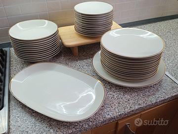 Questo raffinato set include 12 piatti fondi, 12 piatti piani, 12 piatti da dessert, un vassoio ovale lungo 38 cm e un piatto tondo diametro 30 cm, incarnando l’eccellenza dell’artigianato tedesco. Realizzato in porcellana di alta qualità, ogni elemento si distingue per il suo colore avorio, arricchito da un elegante bordo in oro zecchino.