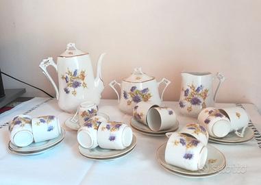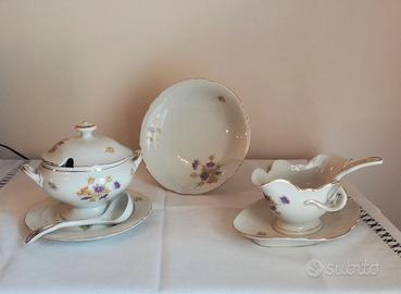 Servizio da tavola completo per 12 persone, più servizio da caffè da 12 (purtroppo manca 1 tazzina), il tutto in porcellana con fine decoro floreale e oro.