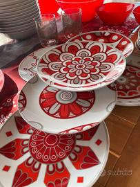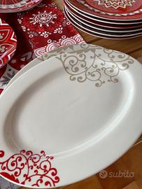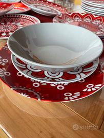 Servizio piatti Excelsa mandala red con bicchieri e runner Excelsa. Aggiungo due piatti ovali in ceramica e 4 ciotole in plastica