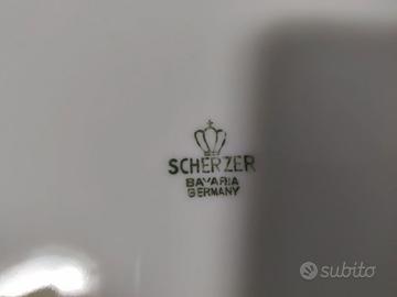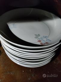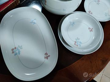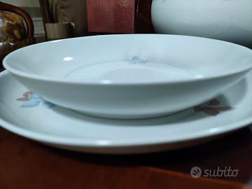 Servizio piatti composto da 12 piatti piani, 12 piatti fondi, 12 piattini da frutta; Insalatiera e zuppiera; un piatto da portata rotondo grande e due piatti da portata ovali (uno medio ed uno piccolo)