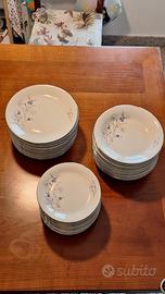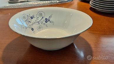 Servizio di piatti da 12 (12 piatti piani, 12 piatto fondi, 12 piatti dessert), più una zuppiera con coperchio, un'insalatiera, un piatto grande da portata tondo e un piatto grande da portata ovale. Ulteriori foto disponibili su richiesta. Colore bianco con decorazioni blu e argento. Nessun difetto!