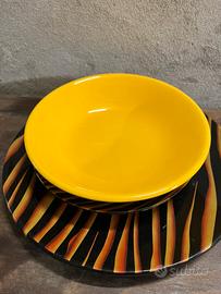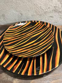 Set di 6 piatti fantasia tigrata, bellissimi colori, di grande impatto composto da piatto piano grande, piatto da minestra e piatto da frutta.
