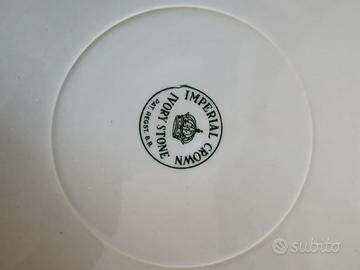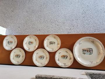 Servizio piatti dolce/frutta con disegno "Diligenza" in ironstone britannica del noto marchio "Crown Imperial Ivory Stone" degli anni '40 nr. 6 piattini + nr. 1 piatto
