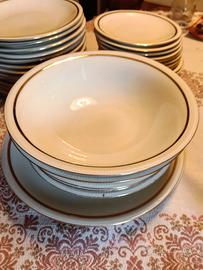 Servizio piatti 32pezzi lavorati sul bordo e riga color oro, porcellana fine di Boheme mod. Tosca. 12 piatti piani 12 piatti frutta/dolce 3 piatti fondi 2. piatti grandi da 30 2. coppe grandi