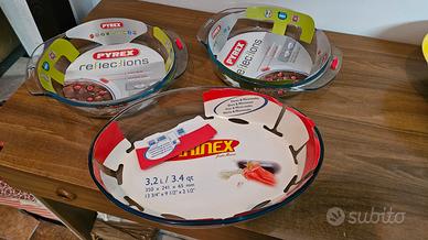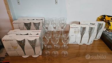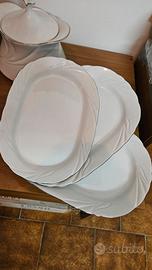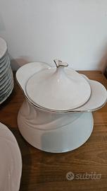 Servizio elegante di 12 piatti piani grandi e 12 piccoli, 12 piatti fondi tutti con orlo in argento, 12 bicchieri per acqua, 12 per vino "Bormioli" in cristallo; 1 Biscottiera/Zuppiera; 3 pirofile e altre e 3 pirofile in pirex Mai usati, Vendo tutto in blocco