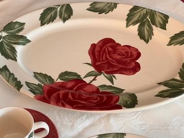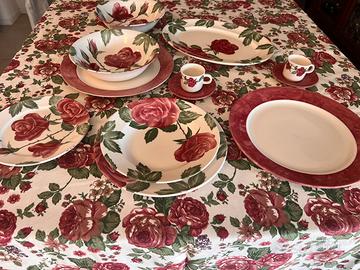 Servizio piatti e caffè in fine ceramica con decoro “rose rosse”, n 7 posti tavola, composto da: 7piattti piani diam. 26 ; 7 piatti fondi diam. cm 23; 7 piatti frutta/dessert diam 20; 7 tazzine caffè con piattio. Pezzi da portata n 7 composti da : 2 piatti ovali (36x26), 3 piatti rotondi diam 30, n. 2 ciotole /insalatiere diam 24, tot pezzi 35. Nuovo con etichette.