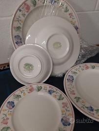 Servizio in ceramica floreale mai usato composto da: 10 piatti pari e fondi/ 1 piatto da portata/10 piattini /10 coppette dolce/ 8 tazzine con piattini caffe/ 8 tazze con piattini/ 4 tazze grandi con piattini/ 1 teiera 1 bricco latte /1 zuccheriera