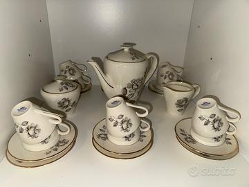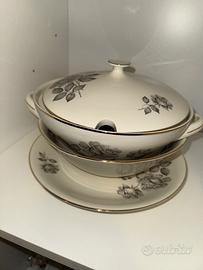 Vendo servizio di piatti intatto, nuovo, senza segni di usura di oltre 60 anni. Nel servizio sono compresi 12 piatti piani, fondi, e piattini, teiera, servizio da caffè compreso di teiera, zuccheriera e lattiera, piatti da portata, zuppiera come da foto