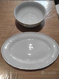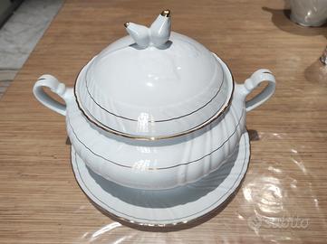 vendo per inutilizzo (max un paio di volte) questo servizio di porcellana Tiffitalia linea oro con piatti fondi e piani, anche con zuppiera, insalatiera, sperlonga. Piu servizio da te completo come da foto.