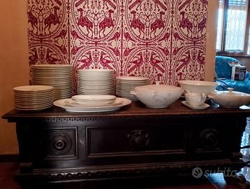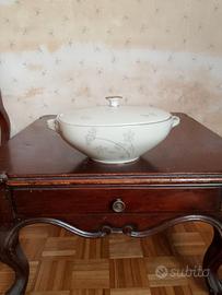 Vendo splendido e rarissimo servizio da tavola firmato ESCHENBACH, noto marchio di porcellana originario della Baviera, Germania. In tutto sono 66 pezzi tra piatti piani, piatti fondi, piattini, piatti da portata, insalatiera, zuppiere, porta condimento con mestolo.. In pregiata porcellana bianca con delicato decoro floreale grigio argento e bordatura in oro zecchino. Un set dal design senza tempo, elegante e minimale, perfetto per chi ama il vintage di alta qualità o per occasioni speciali. Stato di conservazione: Il servizio è in condizioni impeccabili, come nuovo. Non presenta sbeccature, crepe o segni di usura sul decoro. È stato conservato con estrema cura. Marchio originale presente sotto ogni pezzo. Solo ritiro a mano a Roma, zona Nuovo Salario, data la delicatezza degli oggetti.