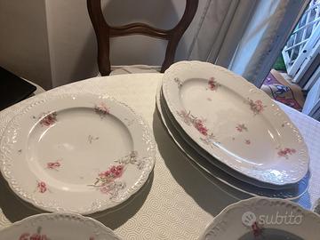 Srvizio piatti Ginori fine 800 mai usato composto da 72 pezzi:36 piatti piani,12 fondi,12 piccoli,4 ovali da portata,1 zuppiera,1 fondina,2 salsiere piccole,2 conchiglie antipasto e 2 alzate frutta modello Elena con attestato museo richard ginori della manifattura di doccia.Vista la difficolta’ relativa alla spedizione preciso che e’ previsto solo il ritiro presso la mia abitazione di roma.