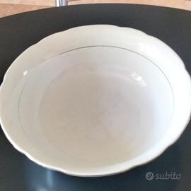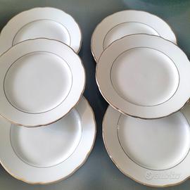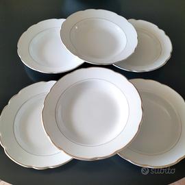 Servizio piatti S.C. Richard risalente alla fine dell'800 inizio/900. Doppia riga oro e bordo merlato. Il servizio è composto: 6 piatti piani dal diametro di cm.23,5 6 piatti fondi dal diametro di cm.23,5 6 piatti da frutta/dessert dal diametro di cm.19 1 insalatiera diametro cm.28,5 Considerando gli anni, il servizio è in ottime condizioni, solo l'insalatiera presenta sul fondo segni d'usura e solo due piatti fondi hanno una leggera crettatura.