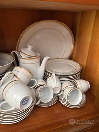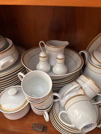 12 piatti piani +12 piatti fondi + 12 piattini + piatto da portata +zuppiera + insalatiera + servizio da 6 tazzine caffè + 6 tazzine da the + 6 ciotole da macedonia + lattiera + zuccheriera + teiera + saliera e pepiera.