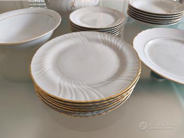 Servizio piatti Tognana da 6 in ceramica bianca con bordino dorato. Nuovi, mai usati. Vendiamo perché è un regalo non in linea con i nostri gusti.