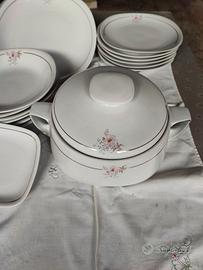 Vendo servizio di piatti in fine porcellana composto da una zuppiera, un piatto da portata rotondo, un piatto da portata ovale, una scodella da portata, un piattino ovale, 12 piatti da dessert, 12 piatti fondi e 24 piatti piani