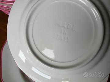 Servizio piatti da 6 in ceramica La Primula fabbricato in Italia alcuni decenni fa. Composto da 6 piani, 6 fondi, 6 da frutta e una insalatiera, lavabili in lavastoviglie. Diametro cm 25, 22, 20 e 24. Bordi colorati divisi in 12 segmenti, fiori al centro. Servizio rigorosamente nuovo con scatola originale. Spedizione a carico dell 'acquirente.