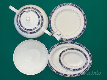 12 piatti piani, 12 piatti fondi, 1 zuppiera, 1 piatto piano grande, 1 piatto ovale grande, 1 piatto ovale piccolo, 1 insalatiera, 12 tazzine da caffè con piattini, 6 tazze da tè con piattini, zuccheriera, teiera, lattiera, bricco con coperchio