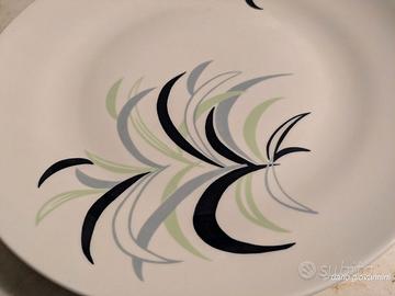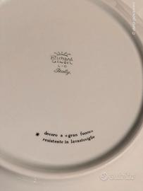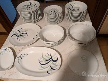 Servizio da tavola in fine porcellana Richard Ginori vintage anni 70, per 12 persone, con motivi di foglie stilizzate su fondo bianco con decoro a gran fuoco resistente in lavastoviglie, composto da 12 piatti piani, 12 piatti fondi, 12 piatti da antipasto/ dessert, una zuppiera, un'insalatiera, 3 piatti da portata.