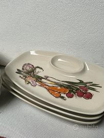Questo simpaticissimo servizio per pinzimonio Presenta illustrazioni dettagliate di verdure, come carote, ravanelli e cipollotti, tipiche dello stile rustico e botanico del periodo.