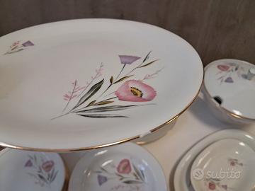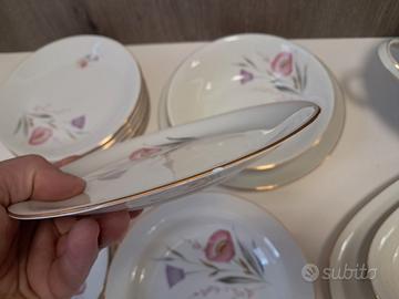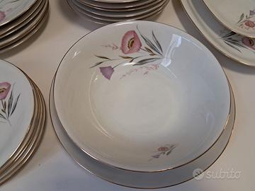 Servizio di piatti in porcellana originale Bavaria Elfenbein Porzellan anni 50 con motivo floreale e bordo oro composto da 24 pezzi: - 6 piatti piani - 6 piatti fondi - 6 piatti dessert - Zuppiera con coperchio - Piatti di portata. Il servizio è in buone condizioni, non sono presenti ingiallimenti. Solo due piatti presentano una scheggiatura e il pomello della zuppiera e stato riparato (comunque il segno della riparazione è quasi impercettibile).