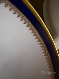 Vendo elegante servizio in porcellana bianca con fascia blu cobalto e decorazioni dorate, dallo stile classico e raffinato.