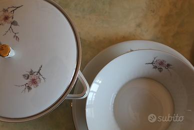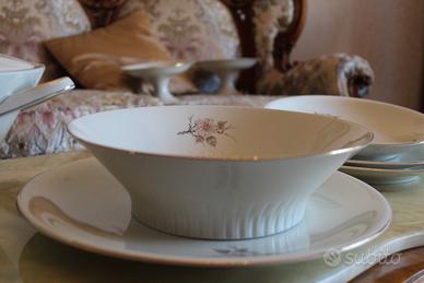 Servizio piatti in porcellana Scherzer. Composto da: 12 piatti fondi 36 piatti piani 10 piattini dolce 2 alzatine frutta 1 zuppiera 5 piatti da portata (1 tondo, 4 ovali) 1 insalatiera