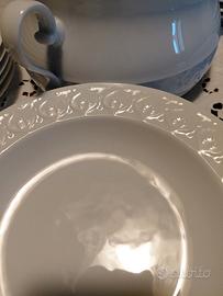 •6 piatti fondi • 6 piattini da dessert • una zuppiera capiente • 2 piatti da portata uno grande e uno più piccolo rettangolari, un piatto da portata tondo, un'insalatiera. 23 pezzi. Decorati sul bordo dei piatti e alla base della zuppiera. Nuovo