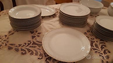 Servizio piatti in porcellana bianca marca Tognana con bordo filo oro, composto da 12 piatti piani, 12 piatti fondi, 12 piatti dessert, zuppiera, piatto da portata rotondo, piatto da portata ovale, insalatiera e salsiera. Senza confezione. Condizioni perfette, mai usato. Consegna a mano solo in Sardegna.