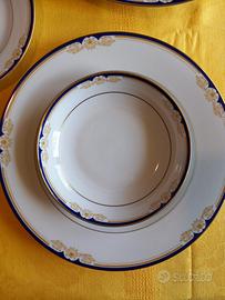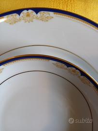 Servizio da 12 piatti lisci, fondi e da dolce, completo di zuppiera, piatto ovale e rotondo da portata e piccola ciotola da antipasti. Bordo oro e blu molto elegante.