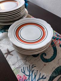 Un set di piatti alta qualità vintage italiani dipinti a mano, prodotto da Primula Italy. Ogni pezzo presenta bordi leggermente smerlati con finiture in terracotta e nero, stile bistrot. Il set include sei piatti piani, 6 per pasta e 6 piatti piccoli, in più un piatto piano grande e piatto fondo grande.