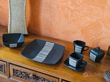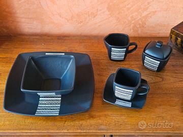 Servizio piatti neri per 6 persone composto da : 6 piatti quadrati grandi 6 ciottole quadrate 6 tazze caffè 6 piattini per tazze 1 bricco 1 zuccheriera Sono come nuovi mai usati.