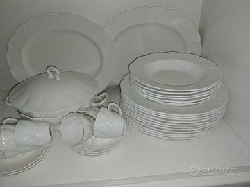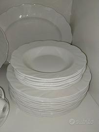 Servizio Queen's Antoinette di ottima porcellana inglese: 6 piatti fondi, 6 da dolce, 12 piani, 6 tazzine con piattini, due vassoi, una zuppiera. Nuovo ma senza scatola perché tenuti in vetrinetta. No spedizione.