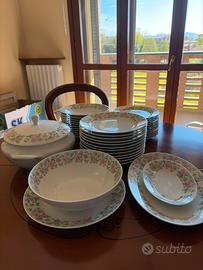 Il servizio è composto da 12 piatti piani, 11 fondine (ne manca 1), 12 piatti da dessert, una zuppiera, un’insalatiera e tre piatti da portata di cui due ovali e uno rotondo. Motivo floreale molto raffinato ed elegante. Siete benvenuti se volete verificare di persona le condizioni, senza impegno volentieri. Per ovvie ragioni non spedisco. I prezzi di set simili in Internet arrivano anche a €1700, è un affare