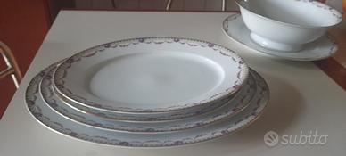Servizio di piatti Richard Ginori, antica art Deco, decoro a ghirlanda. Tenuto benissimo e composto da 34 piatti piani, 12 fondi (1 leggermente sbeccato), 12 frutta, 4 piatti da portata ovali (1 sbeccato), 1 piatto da portata rotondo e 1 insalatiera