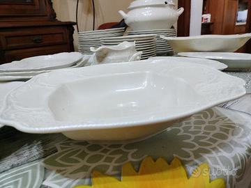 set bianco lavorato a sbalzo comprende 12 piatti fondi,12 piani,11 piattini,3 vassoi ovali grande,medio e piccolo,2 salsiere,2 salsiera con base,1 zuppiera con coperchio.,1 alzata,1 vassoio quadrato con bordo rialzato,1 vassoio tondo,11 tazzine con piattino da caffè.