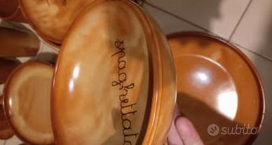 Servizio di piatti rustici in terracotta e ceramica composto da: una pentola grande, una spaghettiera grande, sei piatti fondi, sei sottopiatti , sei piatti piani, cinque piatti da contorno/dessert, sei tazzine da caffè con sei piattini + sei bicchieri alti.