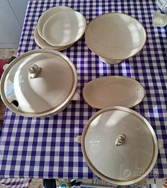 servizio completo piatti ceramica con filo d'oro per 10 persone, completo di zuppiere, di insalatiere, di salsiere di varie dimensioni.