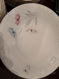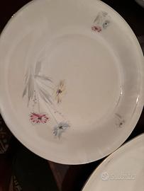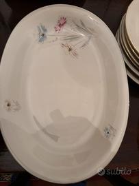 6 piatti piani, 6 fondi, 6 frutta/dolce piu 2 piatti da portata (uno ovale ed uno tondo) ed insalatiera bianchi con decoro colorato