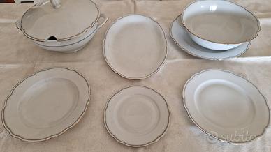 10 piatti fondi, 16 piatti piani, 10 piattini, 1 zuppiera, 1 insalatiera, 1 vassoio tondo, 1 vassoio ovale.