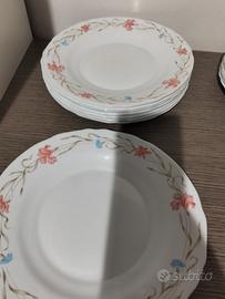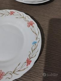 Vendo splendido servizio di piatti vintage della linea Harmonia, prodotto in Spagna (Crivisa) tra gli anni '80 e '90. "Vintage Harmonia Spain dinnerware set, 24 pieces for 8 people. Pink floral design, dishwasher safe."."Service de table vintage Harmonia Spain, 24 pièces pour 8 personnes. Décor fleuri rose, passe au lave-vaisselle."Il set è caratterizzato da un raffinato bordo a festone (ondulato) e un delicato decoro floreale con piccoli fiori rosa e azzurriCaratteristiche principali: