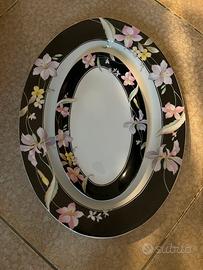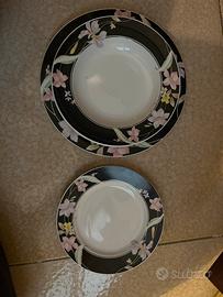 Vendo servizio di piatti vintage firmato Michielotto, linea "Royal Manufacture Japan". Un set dal design sofisticato tipico degli anni '80/'90, caratterizzato da un elegante bordo nero profondo con decorazioni floreali pastello (gigli/orchidee) e profili sottili.
