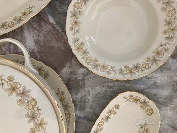 Bellissimo servizio di piatti vintage della Richard Ginori con bordo oro e decoro a festone di foglie e fiori.