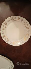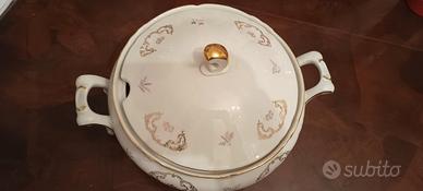 servizio da 6 persone in porcellana originale marchiato comprensivo di zuppiera, piatto da portata, vassoio ovale, insalatiera e piattino porta pane. tutti con bordi e disegni in oro.