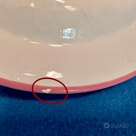 Evidenziato in foto alcuni punti (sempre dalla parte sotto del bordo) dove i piatti hanno leggere sbeccatuure , questo non pregiudica minimamente il loro utilizzo