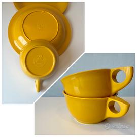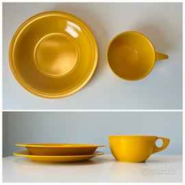 Piccolo servizio per due per i vostri pranzi in terrazzo, i picnic romantici o anche solo perché il giallo è bello e la plastica comoda. 2 fondi, 2 lisci, 2 tazze. Melamina per alimenti marchiato Callegari Market Ravenna, diametro massimo 22 cm. ASVERI l