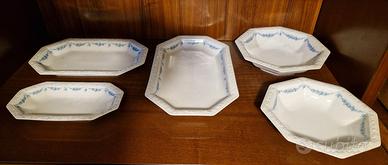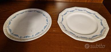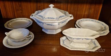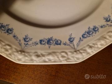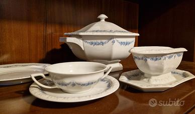 Servizio ROSENTHAL MARIA ROSENKANTE BLAU in porcellana bianca con decorazione a melograni in rilievo sul bordo e con delicato decoro in roselline blu, composto da 106 PEZZI: n.30 piatto piano (poligonale, 12 lati) diametro 24,5-26cm, h 2,5cm n.18 piatto fondo (poligonale, 12 lati) diametro 23,5-24cm, h 4cm n.18 piatto frutta (poligonale, 12 lati) diametro 21,5-22cm, h 2,5cm n.1 zuppiera con coperchio (poligonale, 12 lati) diametro 27-29cm, h 22cm n.12 ciotola/tazze minestra/brodo (rotondo) diametro 12,5-18cm, h 5cm n.12 piatto dolce/frutta (rotondo) diametro 18cm, h 2cm n.1 salsiera (poligonale, 8 lati) 23x14cm, h 9,5cm n.1 Piatto da portata (rotondo) diametro 31cm, h 1,5cm n.2 Piatto da portata (poligonale, 12 lati) diametro 32,5cm, h 4cm n.2 piatto da portata (poligonale, 8 lati) diametro 27-28,5cm, h 6cm n.1 piatto da portata (poligonale, 8 lati) diametro 23,5-25,5cm, h 6cm n.2 raviera/antipastiera (poligonale, 8 lati) 13,5x26cm, h 3,5cm n.2 piatto da portata (poligonale, 8 lati) 20,5x33cm, h 3,5cm n.3 piatto da portata (poligonale, 8 lati) 23,5x39cm, h 4,5cm •La linea Rosenthal Classic Rose (Forma: Maria, Numero forma: 10430, Prima produzione 1914, Stabilimento Selb, Decoro: Bordo di Rose Blu, Numero decoro: 407031) NON è più in produzione come collezione continuativa nel catalogo moderno principale dell'azienda. •La linea Maria Rosenkante Blau, della raffinata porcellana tedesca, prese il nome dalla moglie del fondatore Philipp Rosenthal, che sposò nel 1916. “Maria” rappresenta la storia della porcellana e della cultura della tavola. Queste stoviglie dalla GEOMETRIA POLIGONALE CON IL CARATTERISTICO BORDO LAVORATO IN RILIEVO A GHIRLANDA DI FRUTTI divenne uno dei servizi Rosenthal più ampi e più popolari. •MAI USATO, in perfette condizioni, senza scheggiature o crepe. Alcuni pezzi: ancora nelle scatole originarie (direi tra fine Anni 80 e inizio 90). Una autorevole aggiunta a qualsiasi collezione di porcellane. •NO SPEDIZIONE. RITIRO A CARPI