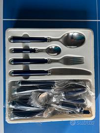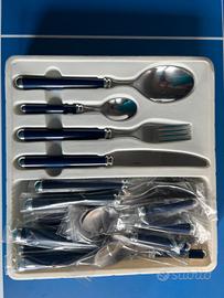 Splendido servizio di posate completo da 24 pezzi firmato Zanetti, eccellenza italiana nella posateria. Il set è per 6 persone e comprende: 6 Coltelli 6 Forchette 6 Cucchiai grandi 6 Cucchiaini da tè/caffè Caratteristiche: Materiale: Acciaio inossidabile di alta qualità (Inox). Design: Elegante manico ergonomico color blu notte con finiture cromate e anello decorativo. Uno stile classico e senza tempo, perfetto sia per l'uso quotidiano che per occasioni speciali. nuovo sigillato