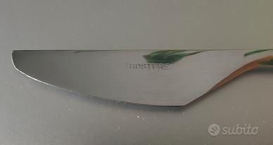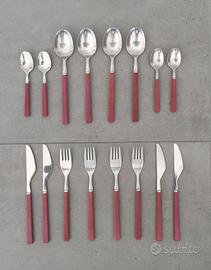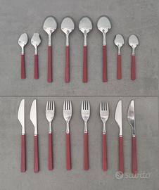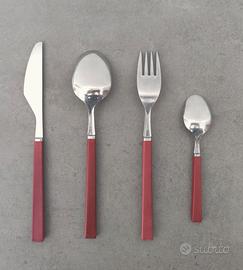 Set di 4+1 posate in acciaio rostfrei con manico in lacca da tavola termoresistente. Composto di 20 pezzi, cucchiai da minestra, coltelli, forchette, cucchiaini da dolce. Sono degli anni ’70 e mantengono un design essenziale e moderno.