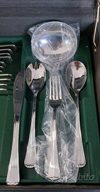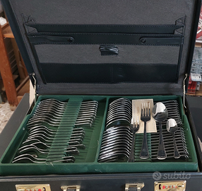 Servizio Posate 75 Pz Inox 18/10 completo di Valigetta. Il Servizio è così composto: 12 Forchette, 12 Cucchiai, 12 Coltelli Tavola, 12 Cucchiaini ,12 Forchettine dolce, 12 Forchette Frutta , 1 Mestolo, 1 Cucchiaione , 1 Forchettone.